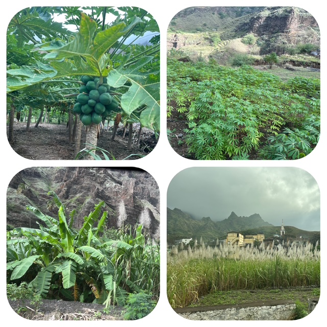 et plantations. Dans l’ordre: Goyave, manioc, banane et canne à sucre